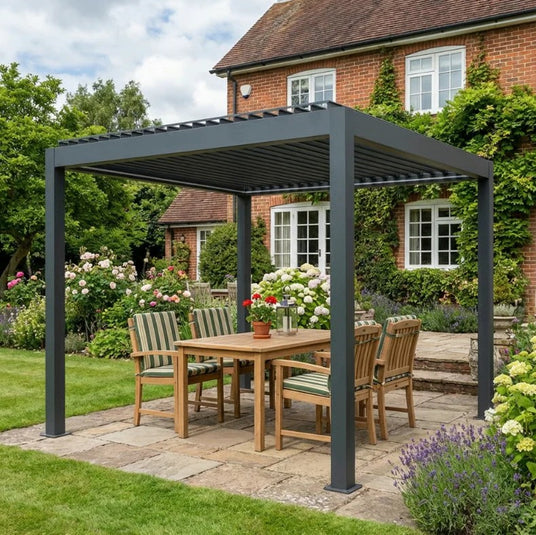 Roof style is usually the deciding factor. Some of our 3m x 3m metal pergolas come with hardtop roofs for proper overhead cover. Others feature louvred roof systems, giving you control over sunlight and airflow. If rain protection is important to you especially (and in the UK, it usually does), many designs include integrated drainage systems to channel water away neatly. Colour options tend to lean towards contemporary tones like anthracite grey or black, making them easy to pair with modern garden furniture and patio layouts.